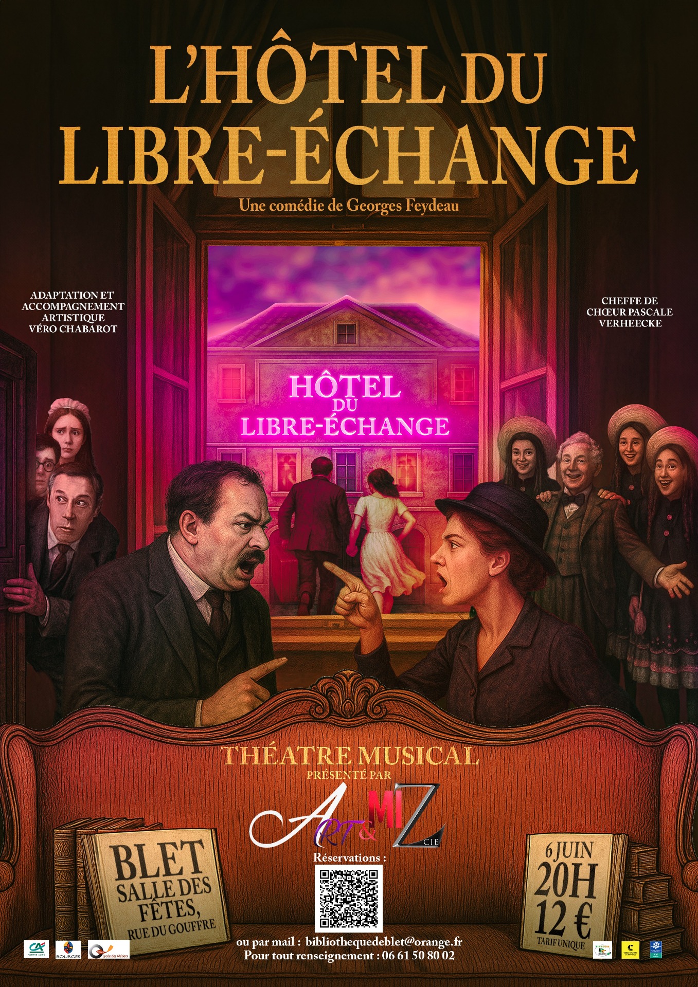 L'association Les Amis de la bibliothèque de Blet est heureuse de vous présenter la Compagnie Art&Miz et son nouveau spectacle : Adaptation de l'Œuvre de Feydeau : Hôtel du Libre-Échange en théâtre chanté à la salle des fêtes de Blet le 06 juin 2026 à 20h.